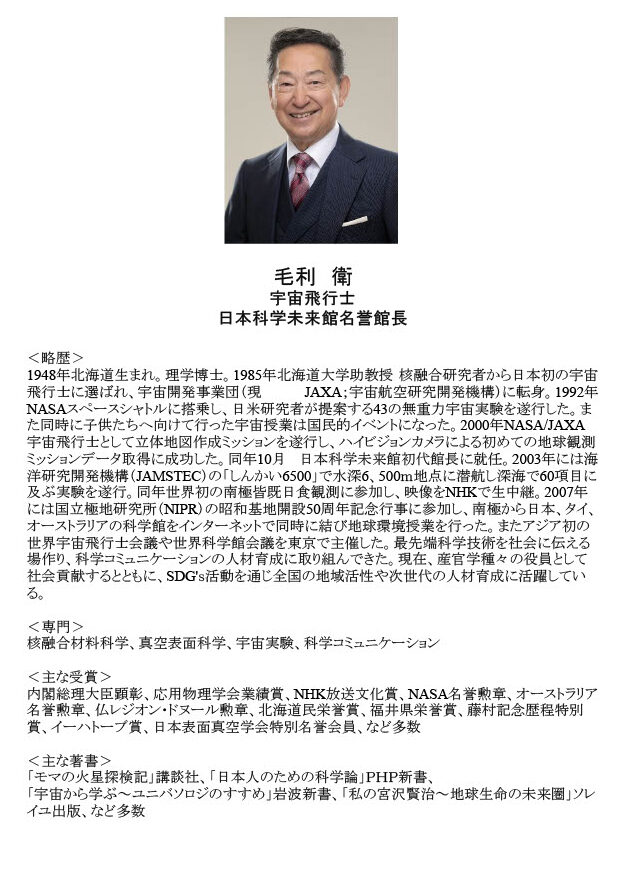 地球を宇宙から見つめた毛利さんの体験は、私たち一人ひとりに深い問いを投げかけてくれることでしょう。